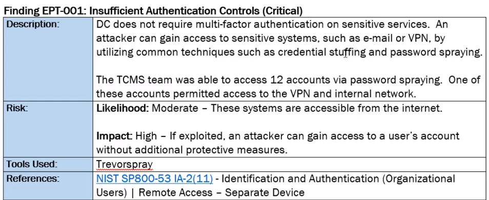 • Summary of where their securty holes are (MFA, Weak password policies, Unrestricted logon attempts, etc)