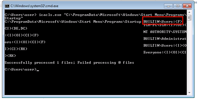 icacls.exe "C:\ProgramData\Microsoft\Windows\Start Menu\Programs\Startup"